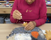 Needle felting is a dry felting method typically using wool with its barbs that felt quickly and easily. However, we use alpaca for a softer and more artistic effect. Our crafters have mastered this art form and now use this media for sculptures, flat art, and clothing embellishments.
