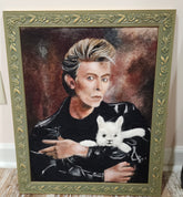This striking fiber portrait celebrates the legendary David Bowie, reimagined in alpaca fiber with an alpaca companion at his side. Hand-painted alpaca fleece captures Bowie’s iconic presence—his electric energy, bold color, and transformative style—layered into rich textures that bring him to life in a new medium. The alpaca adds both tenderness and whimsy, symbolizing Bowie’s playful spirit and connection to imagination.